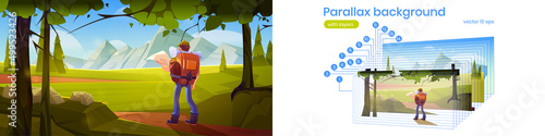 Parallax background traveler with map stand at beautiful landscape with forest, valley and mountain peaks. Travel journey, hiking adventure template for 2d game animation, Cartoon vector illustration