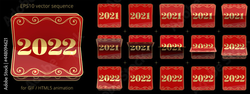 2022. Animated flip calendar for New Year's events. Banner with a date flipper. Black and silver 3D icon of counter. Vector sequence for GIF, HTML, flash animation. Sprite sheet of 12 frames.