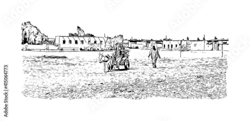 Building view with landmark of Cairo, Egypt’s sprawling capital, is set on the Nile River. Hand drawn sketch illustration in vector.