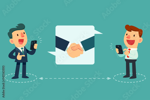 Vector cartoon business people wearing medical masks stand apart from each other for design.