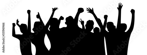 Cheerful crowd of people cheering applause. Party disco concert sport. Fan happy people. Silhouette vector illustration