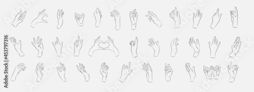 Woman's hand icon collection line. Vector Illustration of female hands of different gestures - peace, okay, symbol Gun, Fuck You, Lucky, heart. Lineart in a trendy minimalist style.
