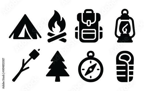 Vector icon set illustrating outdoor camping and hiking activities with essential gear and nature elements for adventure enthusiasts