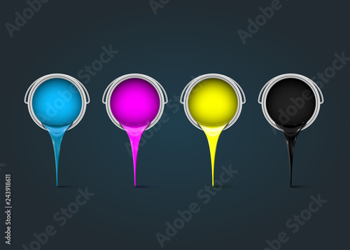 The CMYK color ink bucket throwing paint