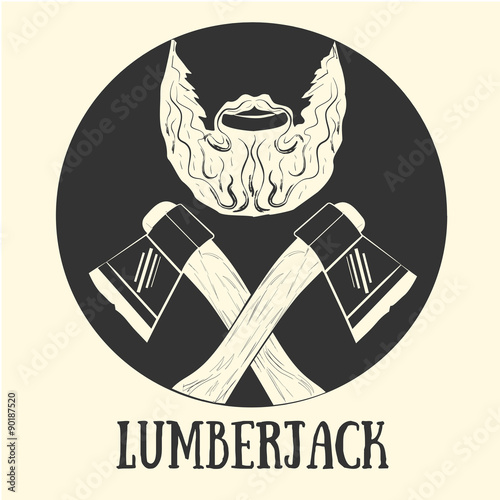 Lumberjack vintage label with two axes and trees. Hand drawn textured grunge vintage label, retro badge or T-shirt typography design, hipster T-shirt print design. Hand drawn vector illustration