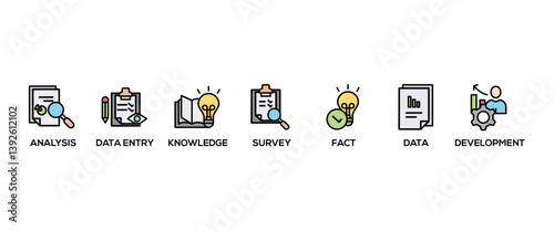 Research infographic icon flow process which consists of analysis, data, survey, development, fact, knowledge and data entry icon live stroke and easy to edit .