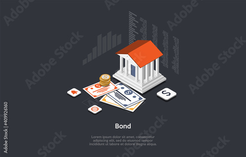 Vector Illustration. Cartoon 3D Style. Isometric composition. Conceptual Design. Bond Insurance Documents. Financial Banking Service. Big Building, Different Money Items, Infographic Elements Around.