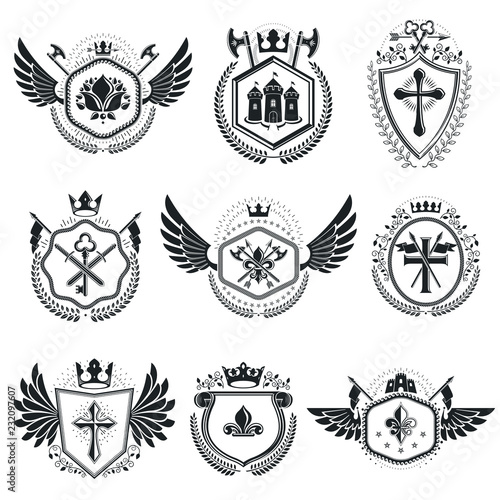 Classic style emblems big set, ancient heraldic symbols awards and labels collection, classical heraldry design elements, family or business emblems.