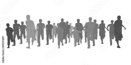 Silhouette of running people isolated on white background. Men, women and children running. Front view. Vector illustration.