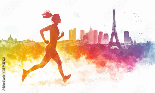 colorful watercolor image with running woman in front of the skyline of paris on white background
