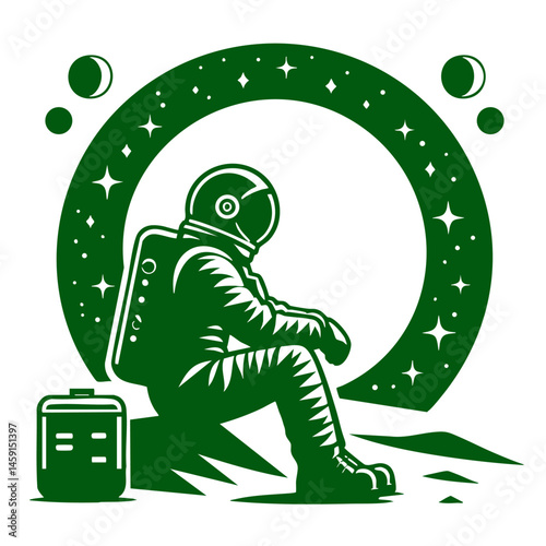 A stylized illustration depicts an astronaut in an orange spacesuit gazing out at a starry cosmos from near the moon.