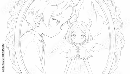 Black and White Vector Illustration of a Contemplative Figure Gazing at a Mirror - Ideal for Reflection Themes