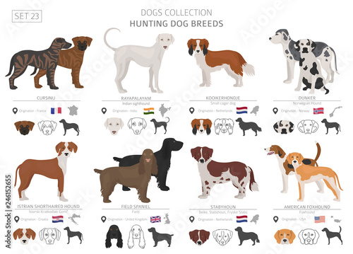 Hunting dogs collection isolated on white. Flat style. Different color and country of origin