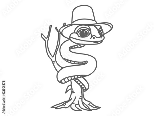 icon illustration of a cute snake wearing a hat and wrapped around a tree