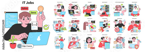 A colorful array of diverse characters represent various IT professions, from Python programmers to network engineers, showcasing the vibrant world of technology careers.