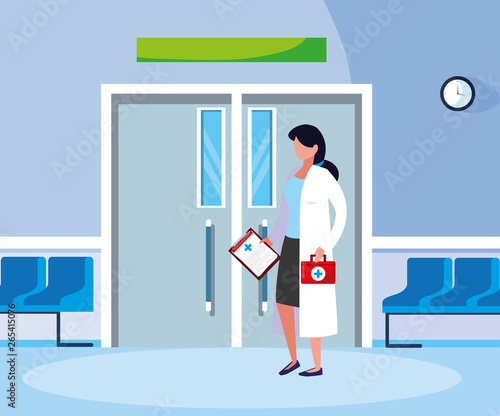 Female patient in doctor office flat vector illustration. Cartoon physician helping with diagnosis and medical therapy. Healthcare and hospital treatment concept
