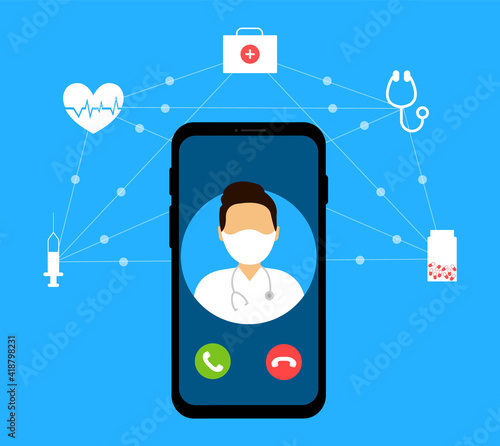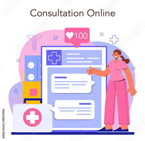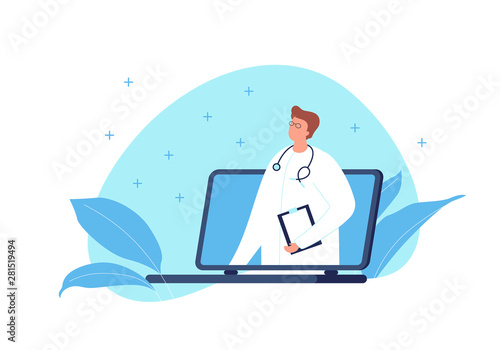 Pharmacist online concept. Man in medical uniform near pills and medicines. Electronic commerce and online shopping. Healthcare and medicine. Flat vector illustration