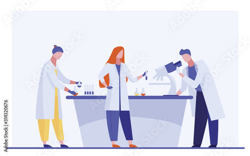 set of male and female scientist in uniform lab holding chemistry glass and wearing lab glasses. female scientist teaching student vector illustration