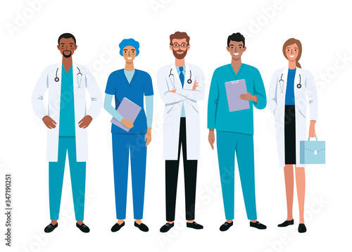 A group of doctors stand in a row, each wearing a white coat. Vector icon