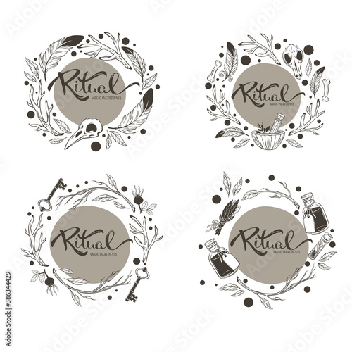 Vintage magic potion bottles and mystical card for alchemy and fantasy design