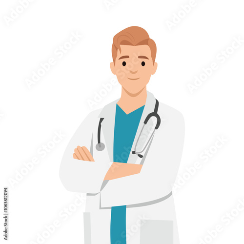International doctors day. Clinical professionals, men and women doctors in white medical gowns with world map. Healthcare vector concept. Medical doctor day, hospital staff care illustration