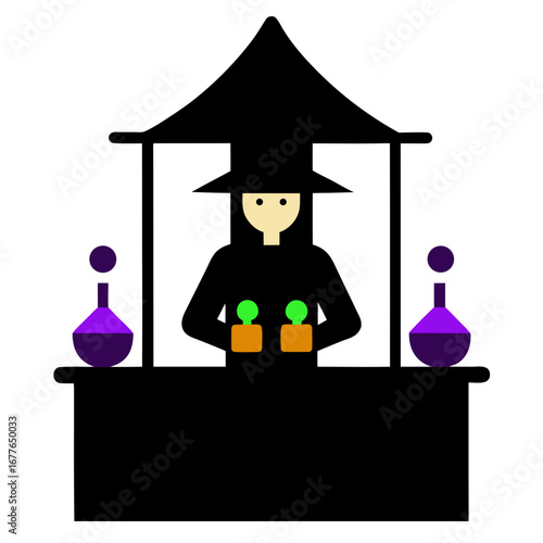 Potion bottles. Game alchemist liquids on wooden shelf, cartoon love potion, poison, magic elixir. Vector set of fantasy game chemical jars for magic alchemy laboratory
