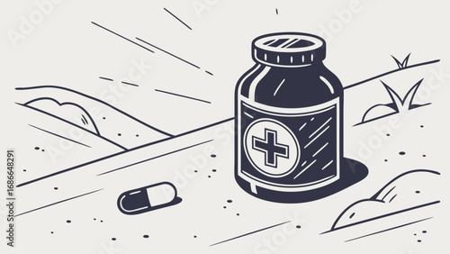 Drugstore. Medicine bottle and pills. Medicament. Black and white icon. Vector illustration, dose, disease, pill