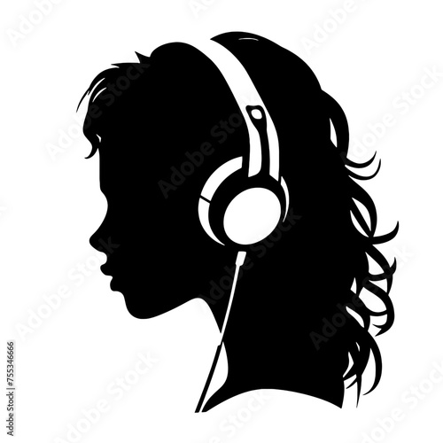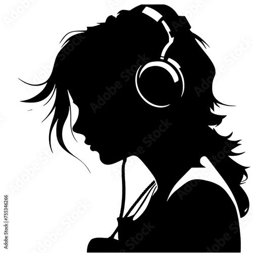 The girl listens to music on headphones . Profile of a young   woman. Musician avatar side view. Vector flat illustration
