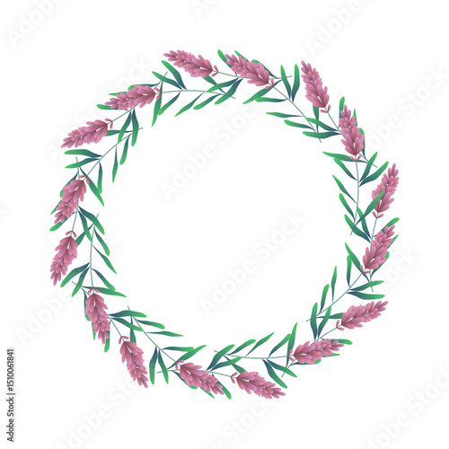 Circular green frame adorned with decorative leaves, lavender. Abstract botanical design perfect for banners, greeting cards, and invitations. Vector illustration