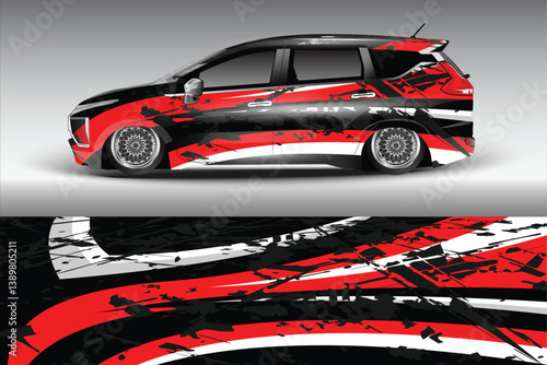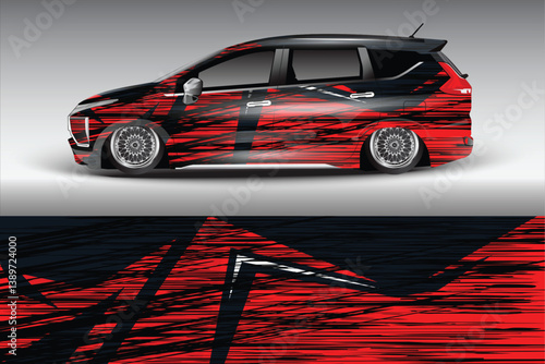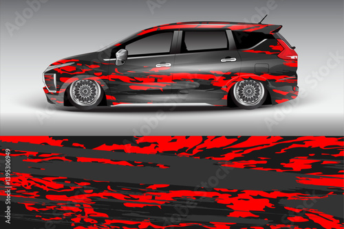 Stylish modified car with a striking red camouflage wrap showcased against a sleek gray background