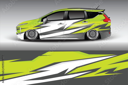 A sleek, modified car with vibrant yellow and black graphics, showcasing its sporty design in a minimalist setting