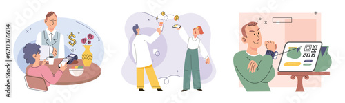 Contactless cashless payment set. Hands with credit card, mobile phone, smart watches pay by pos, scan QR, transfer digital money. NFC technology concept. Flat isolated outline vector illustrations