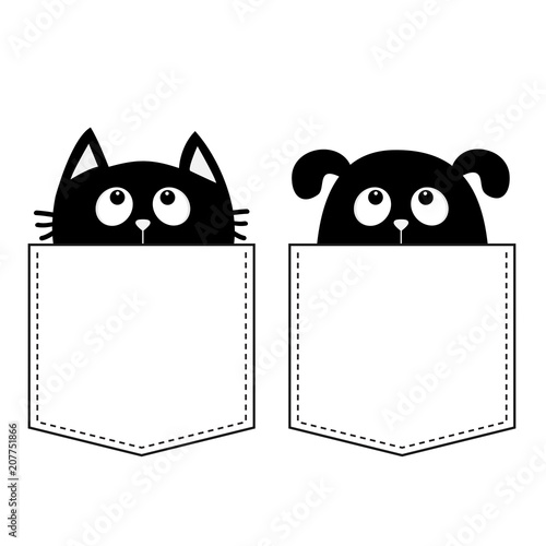 Cat Dog in the pocket. Cute cartoon animals. Kitten kitty Puppy pooch contour character. Dash line. Pet animal collection. White and black color. T-shirt design. Baby background. Isolated. Flat