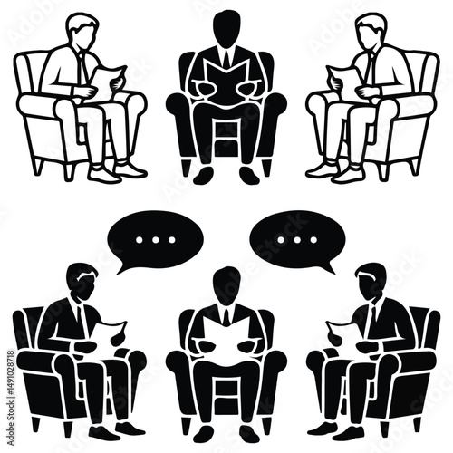 A Man sitting in armchair and talking with psychologist. Thought, therapy, mind flat vector illustration. Mental health and psychology concept