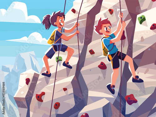Two children rock climbing against scenic sky mountain background. Boys displaying teamwork adventurous spirit while engaged outdoor sport activity. Young climbers equipped harnesses, ropes, safety