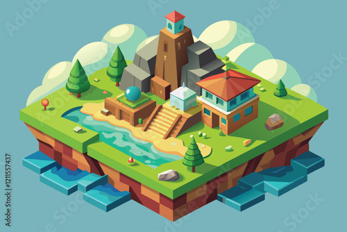 A detailed isometric island showcases a cozy house, towering rocks, trees, and a winding stream in a playful landscape, Island Customizable Isometric Illustration