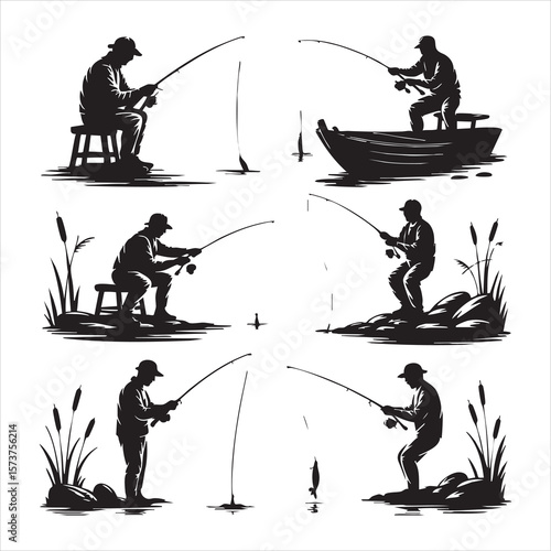 Collection of six black silhouette illustrations of people fishing in various settings on white background