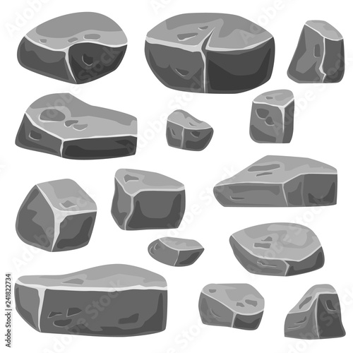 Cartoon natural stones. Boulder rock, stone and rubble pile. Isolated 3d mountain, gray rough granite decoration material recent vector collection