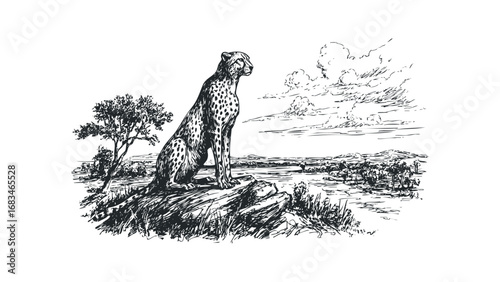 Sketch of a cheetah sitting on rocks overlooking a savanna landscape. Vector hand drawn illustration