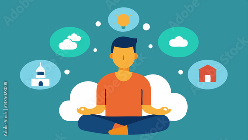 Mindful Reflection A silhouette of a meditating person with thought bubbles showing scenes of gratitude e.g. loved ones favorite places amidst a background of confusion and