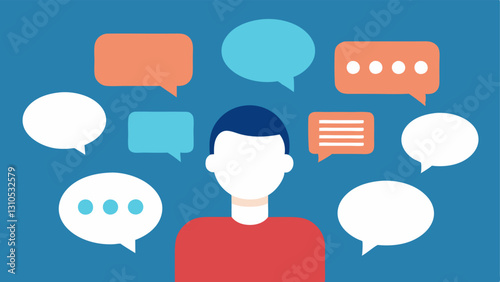 Speech Bubbles Multiple speech bubbles surrounding a person with some filled with clear phrases and others obscured or filled with static representing the layers of communication