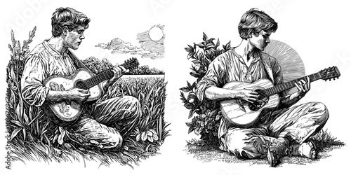 An acoustic guitarist plays by the water against a sunset evoking a peaceful vibe sketch engraving generative AI raster illustration. Scratch board imitation.