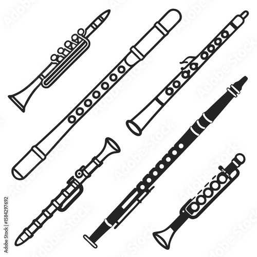 Woman in black dress with flute, long braid hairstyle, dark background, elegant and artistic concept. Vector illustration