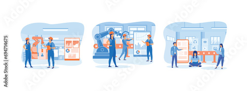 Smart Factory. Production line with workers. Sharing media data with a system. Smart industry set  flat vector modern illustration