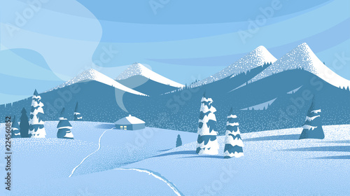 Winter season banner. Idyllic snowy winter landscape greeting card. Vector illustration of a winter mountain landscape with snowy fir trees, hills and snowfall on blue gradient background.