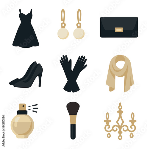 Elegant Fashion Icons. Flat icon set of style: elegant dress, pearl earrings, clutch bag, high heels, evening