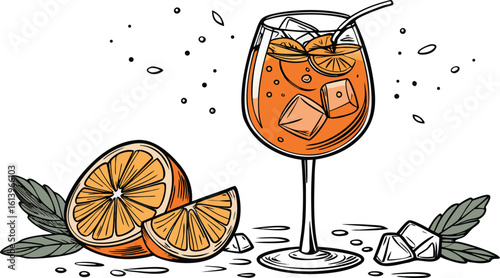 Hand-drawn sketch illustration of a refreshing summer cocktail with an orange slice and herb garnish. Artistic aperitif drink.