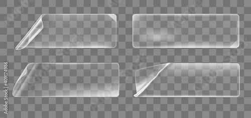 White square glued stickers with curled corners mock up set. Blank white adhesive square paper or plastic sticker label with wrinkled, crumpled effect. Blank template label tags. 3d realistic vector