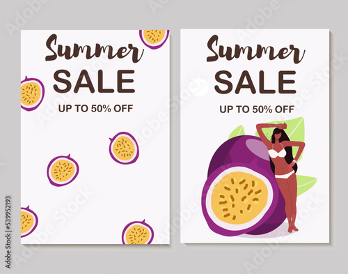 Colorful vector summer sale layout poster, banner, background, vacation mood, cards, invitation, summer vibes, tag, sale, huge avocado, fruit, tiny tanned girl.