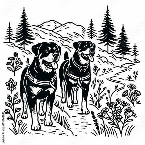 Two hikers with backpacks pausing to admire a majestic mountain range in a woodcut style